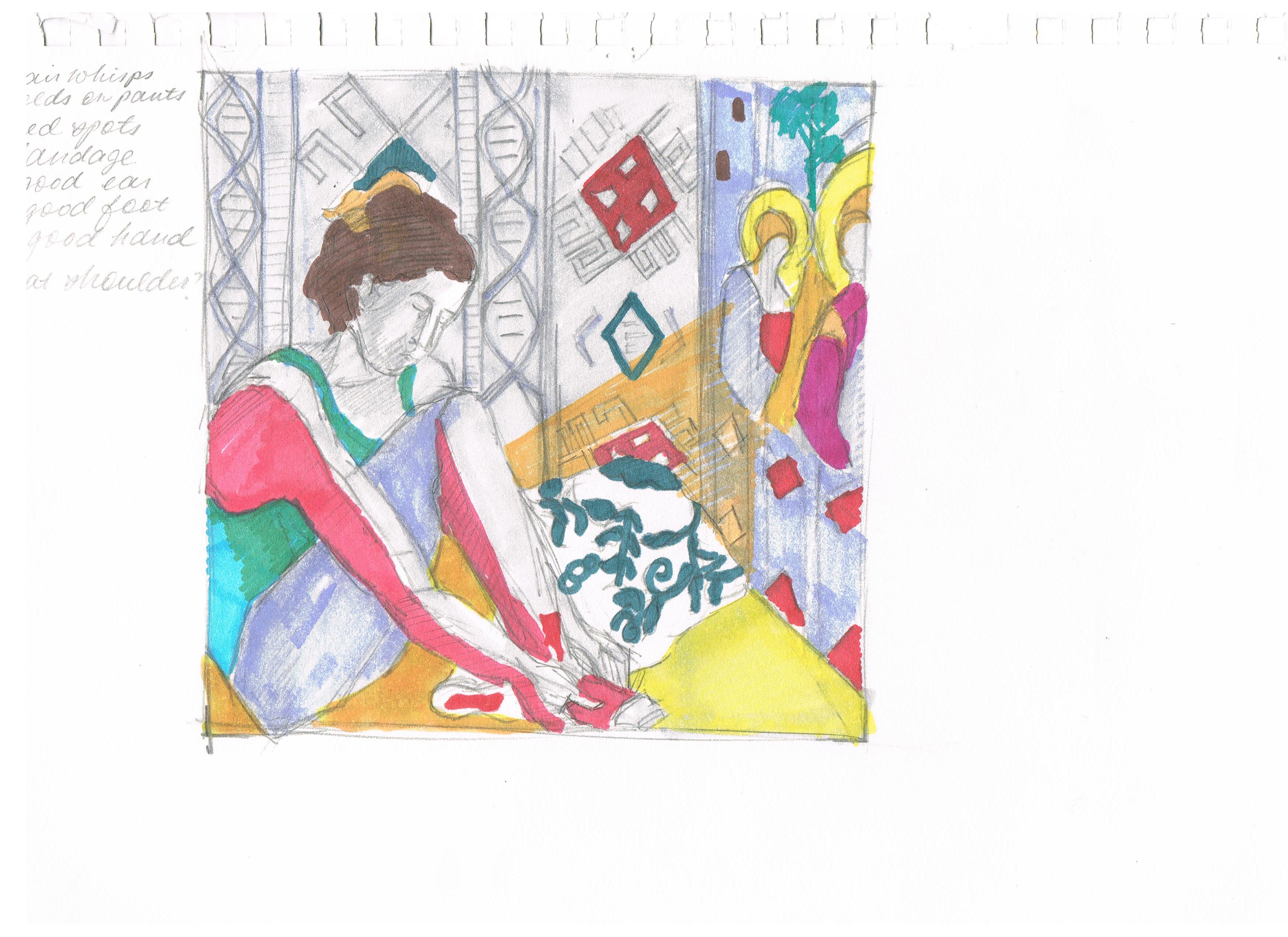 Graphite, marker, pen, colored pencil on paper.